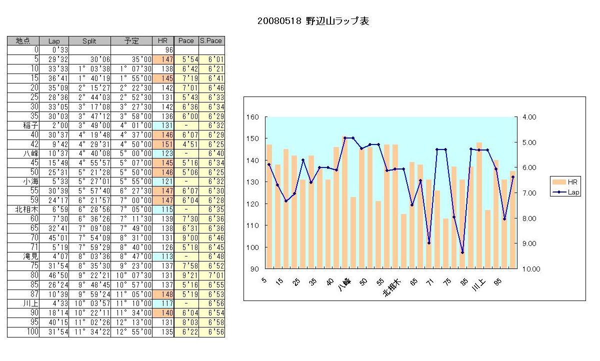 (54.6k川又…予定:6時間25分 実際:5時間56分位 休憩時間:1分 区間平均:6’18)