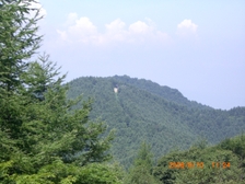 山頂からは、これから登る大松山の頂が遥か向こうに拝めました…。「げ、あそこまで登るの…」とやや腰が引けましたが、目先の下りに騙されて、ホイホイ調子よく駆け下りてしまいました…。