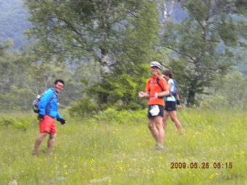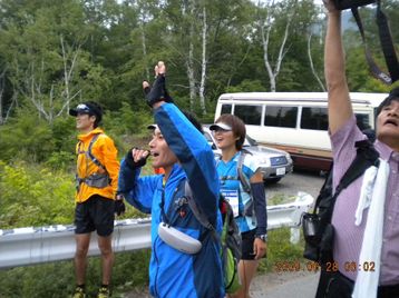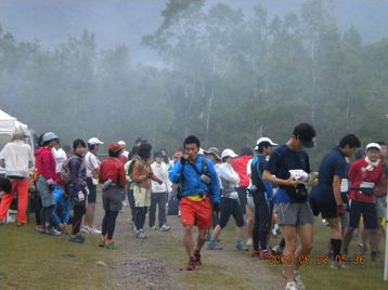 その後、付いて行く気力も失せ、ひいこら言いながら一人旅でエイドに戻ってきて40kをクリアすると、ゴール係をやってた大内さんが、「アッチ!アッチ!」と指差すので、その方向を見ると、弐号が一目散に駆け出していくとこでした。