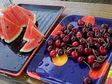 バゲットサンド(ハムチーズ,チキン) 、アメリカンチェリー、ゼリー(グレープフルーツ、サイダー)、岩魚の塩焼き、ビール、蕎麦豆腐、紅茶のチーズケーキ、トマトのパスタ、