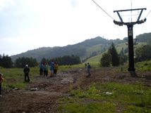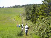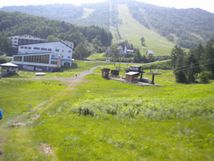 山頂の池までは行かないようで、スタッフのお姉さんと雑談。約40秒休憩。切り開いたようなトレイルを抜け、少しだけ湿地を登って、あとはゲレンデ下り開始です。