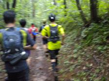 雨でぬかるんだトレイルを走る。このあたりは、まだゴアが有効。